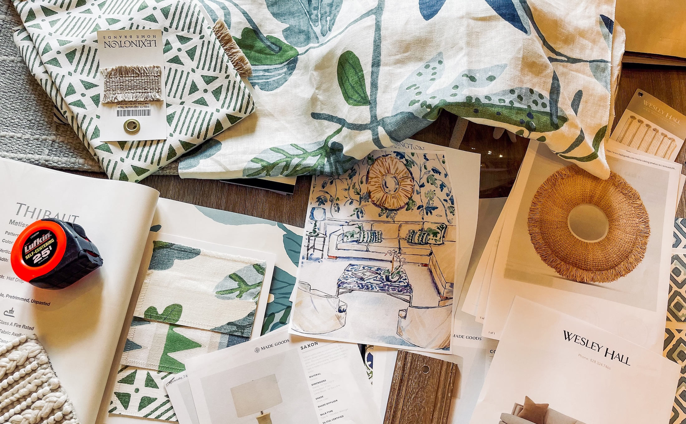 An interior design planning layout with blue and white fabrics for a Naples, FL residence.